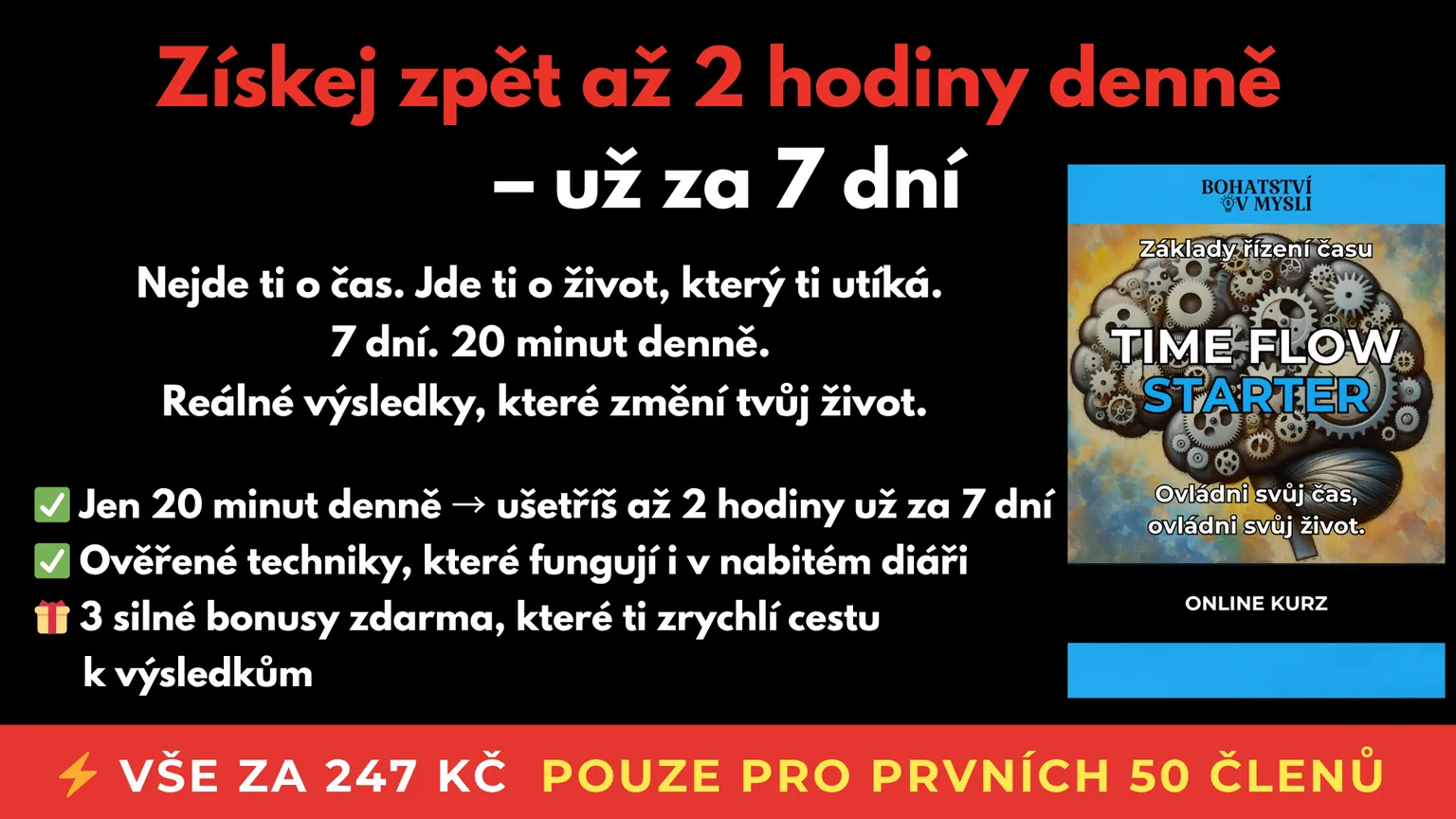 P.S.: Zamysli se - kolik stresu, času a peněz tě stojí každý další den bez funkčního systému? Time Flow Starter ti dá zpět 2 hodiny denně. To je 60 hodin měsíčně! A to vše za pouhých 247 Kč - méně než stojí jeden kvalitní oběd.